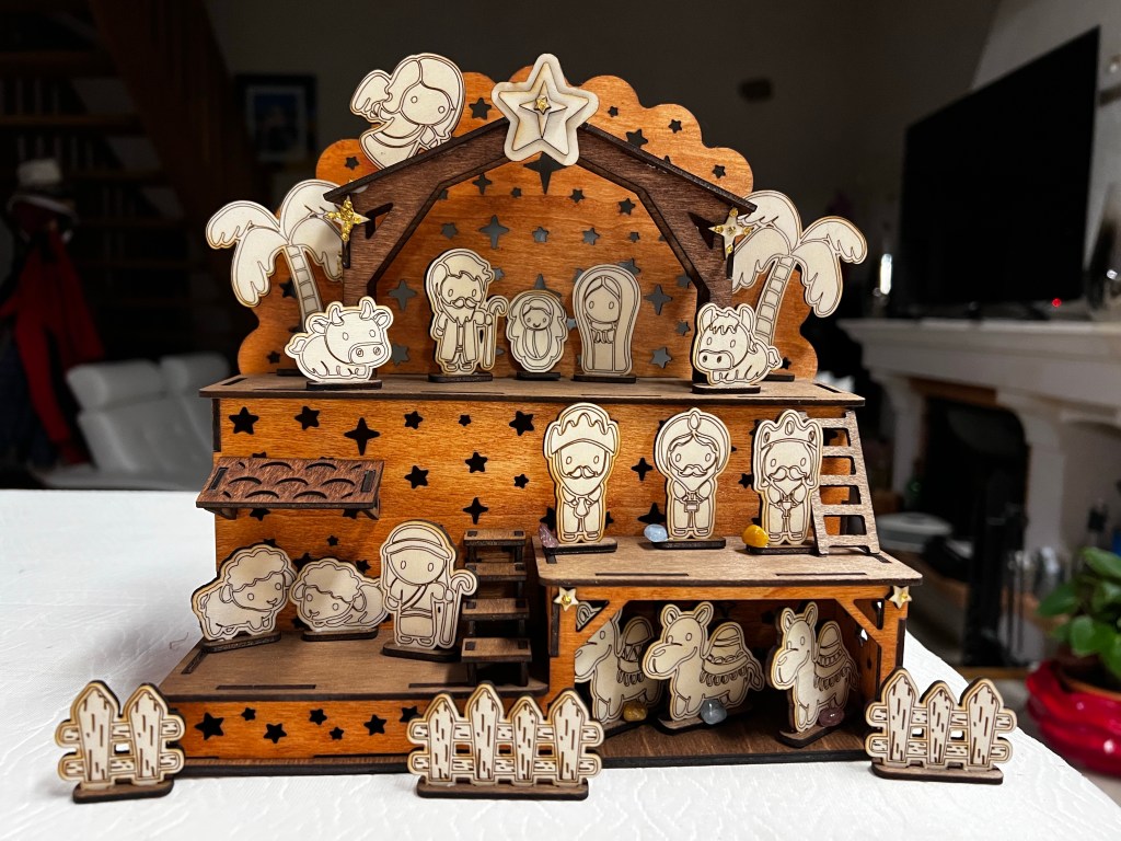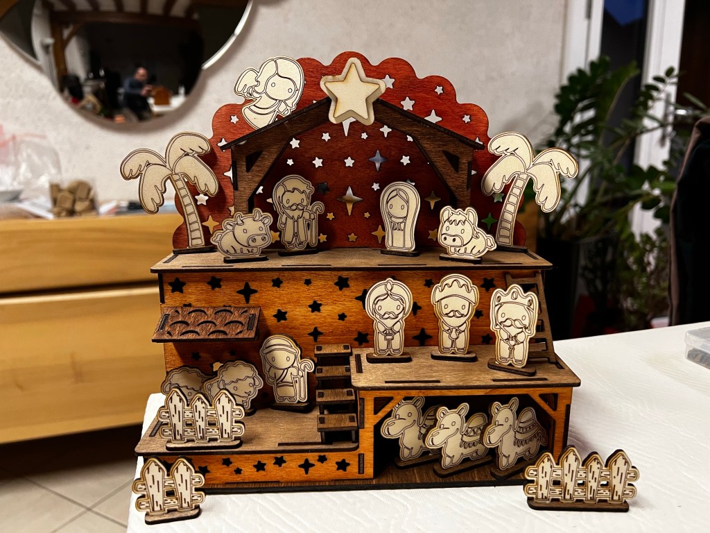 1 ange, 2 palmiers, la nativité (Jésus, Marie, Joseph), 1 ane, 1 boeuf, 2 moutons, 1 berger, 3 rois mages, 3 chameaux, 3 barrières.