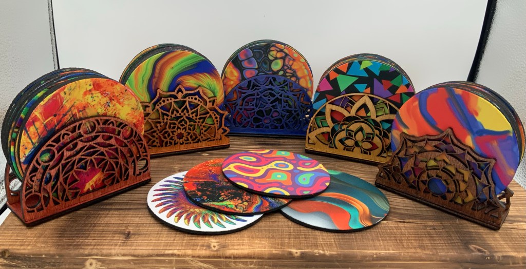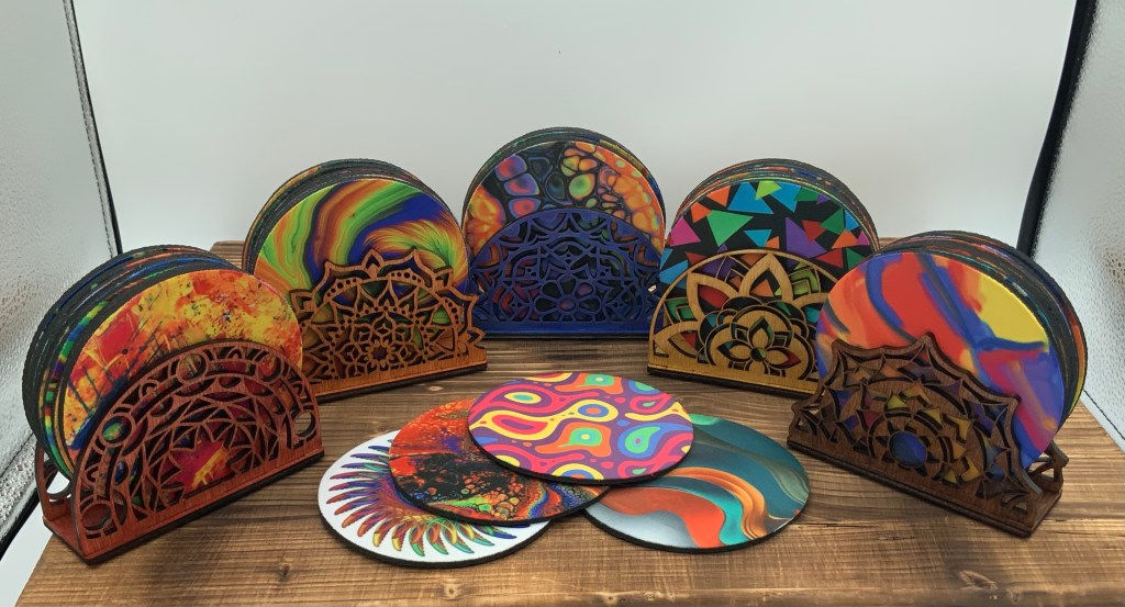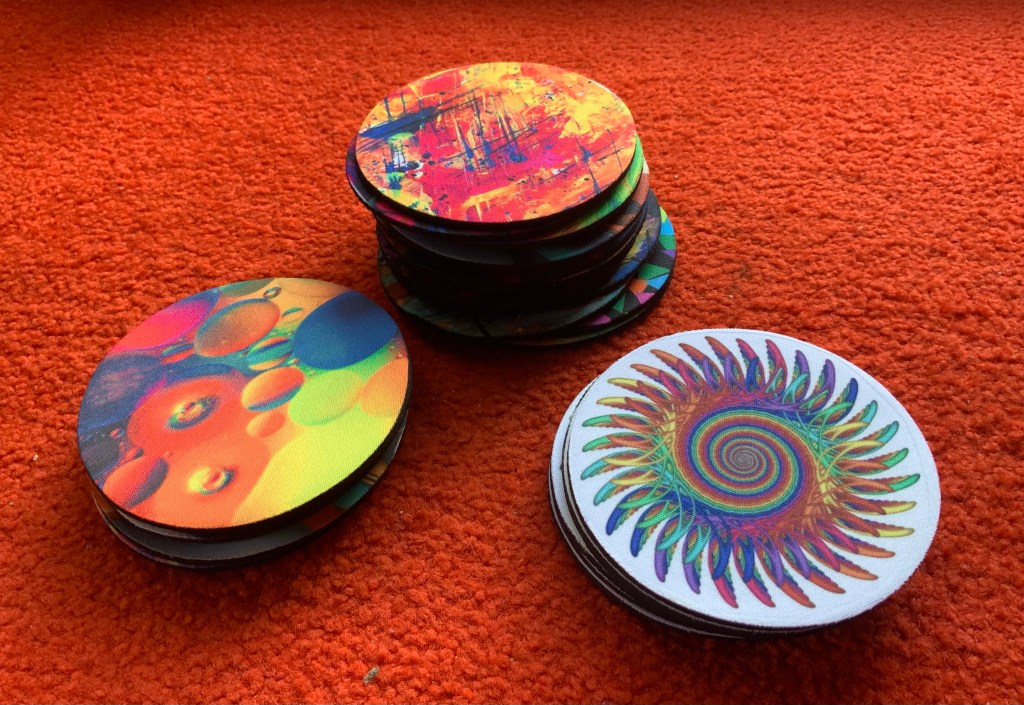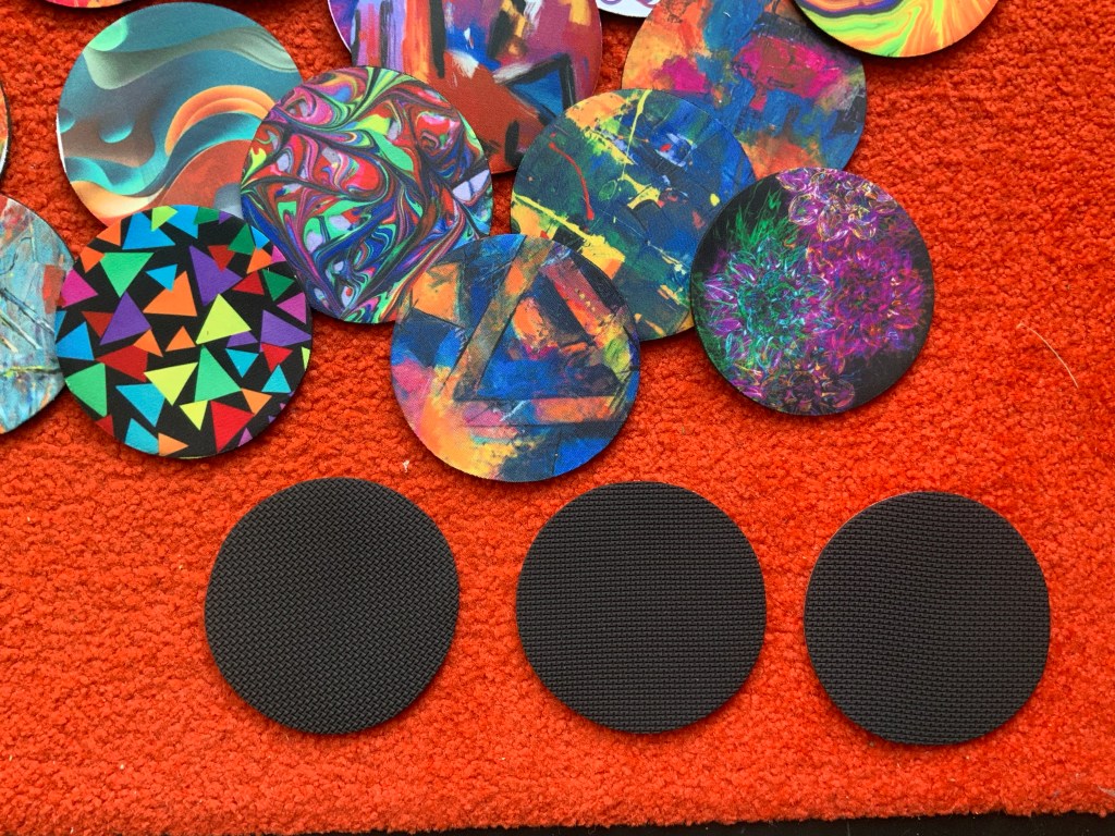 8 Ronds en caoutchouc multicolores de 10 cm environ dans un support en bois