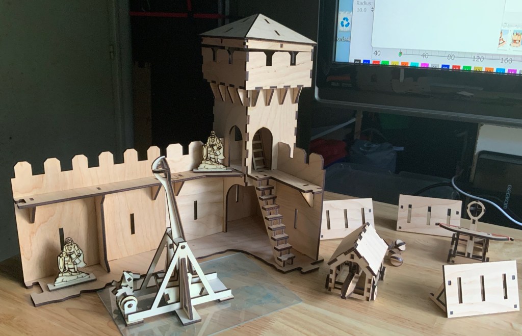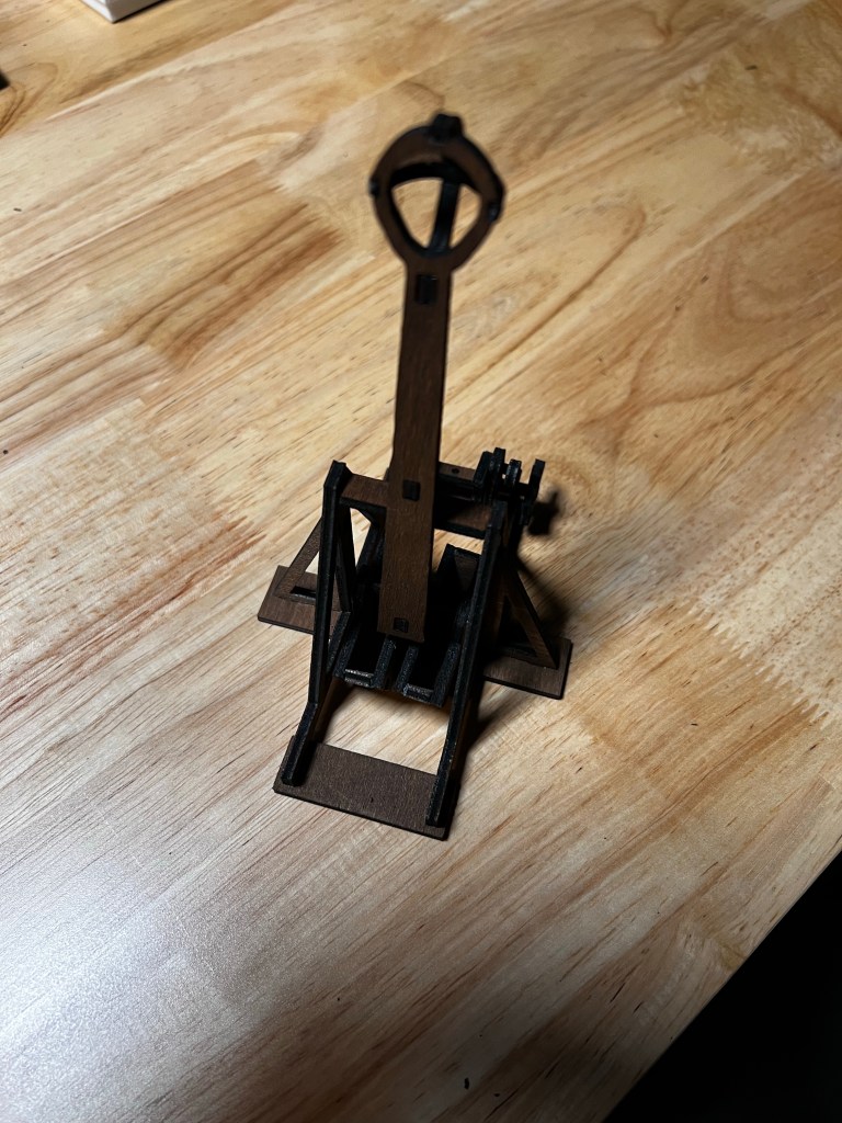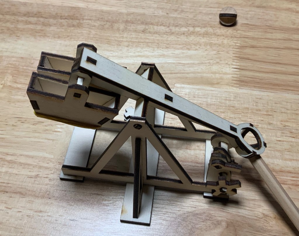 Un trébuchet est une machine de guerre médiévale utilisée pour lancer de lourdes pierres ou des projectiles sur les fortifications ennemies. Il est composé d'un bras de levier qui pivote autour d'un axe fixe, avec un contrepoids attaché à une extrémité et une fronde à l'autre extrémité. La fronde est remplie de pierres ou de projectiles et est libérée en tirant sur une corde qui maintient le projectile en place. Lorsque la corde est relâchée, la fronde se balance vers l'avant, propulsant le projectile à grande vitesse vers sa cible. Les trébuchets étaient souvent utilisés pour attaquer les murs des châteaux ou les portes des villes fortifiées.
